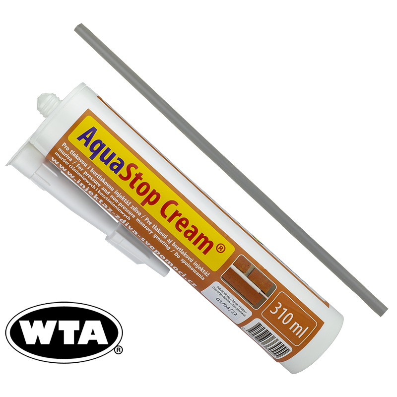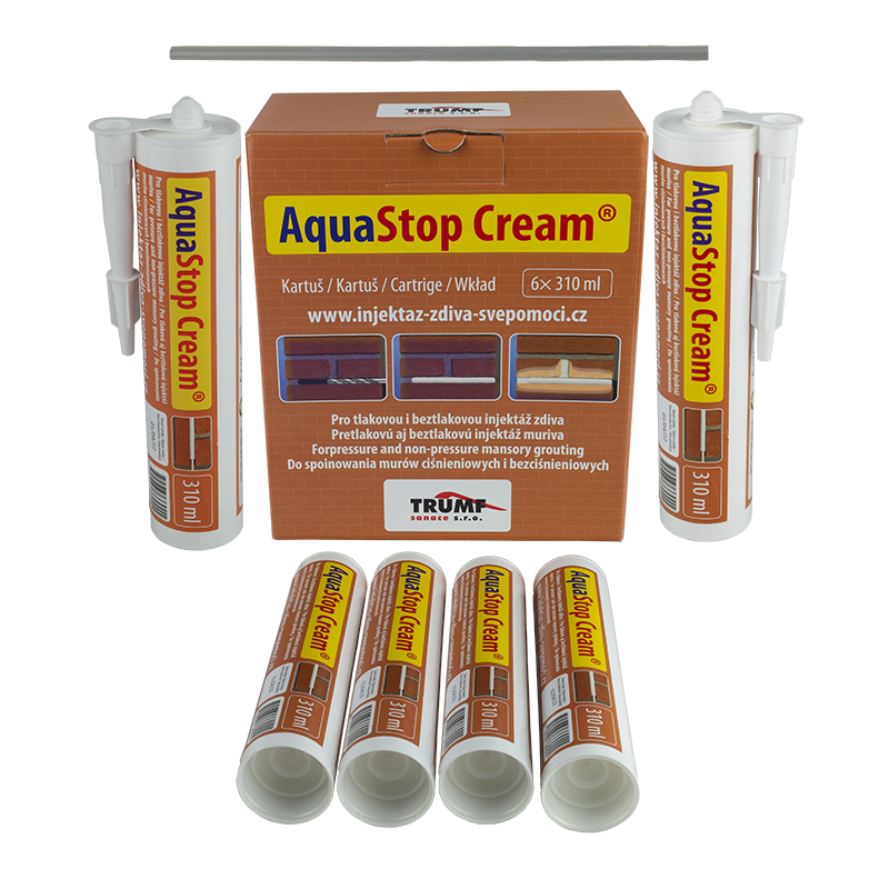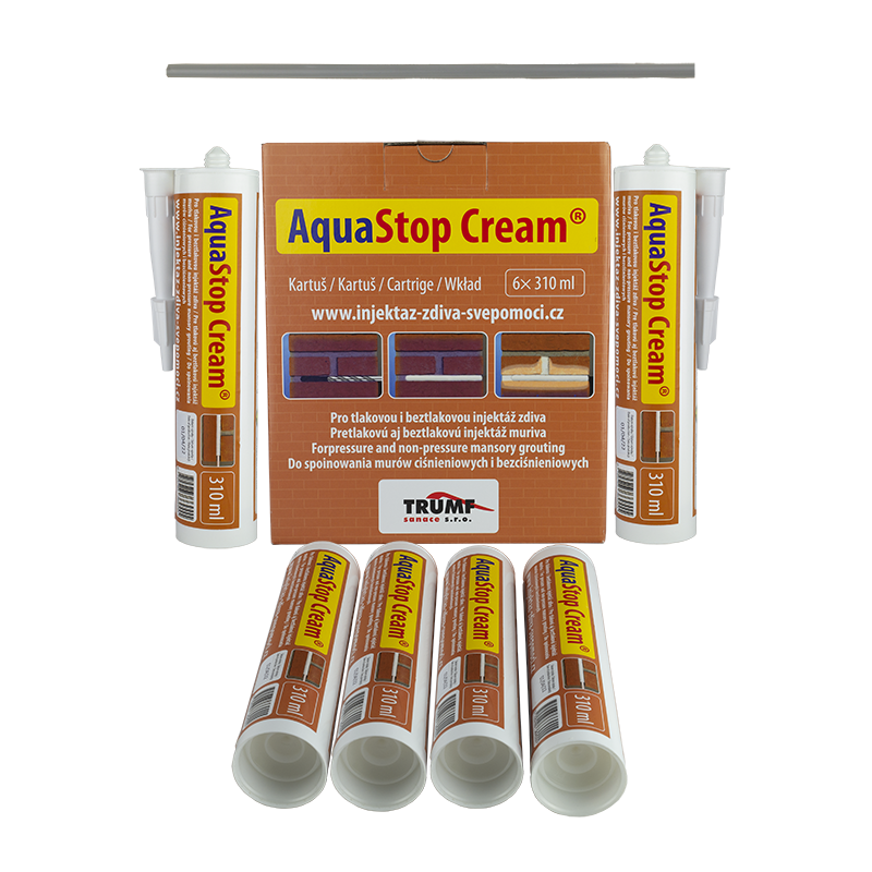 AquaStop Cream® je injektážní krém (pasta) na silanové bázi s více jak 80% koncentrací aktivní látky silan/siloxanu v obsahu a je určený pro injektáž zdiva pro zamezení vzlínající vlhkosti.