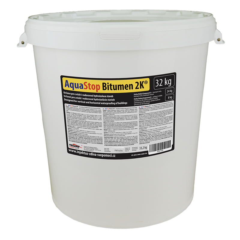 AquaStop Bitumen 2K® je plněný speciálními vlákny, které přispívají k bariérové ochraně vytvrzené vrstvy v celé tloušťce struktury. Vlákna zvyšují pevnost bitumenové vrstvy na tlak, tah a ohyb. Po smíchání složky A a urychlovače, složky B, vznikne hustý tmel, který dokonale přilne v horizontální i vertikální poloze (nemá tendenci stékat) ke všem stavebním podkladům (beton, cihly, dřevo apod.). Stěrkový tmel má lepší přilnavosti k vlhkému podkladu. Je vodou ředitelný, v případě potřeby lze upravit konzistenci. Nelze ho mísit s jinými .